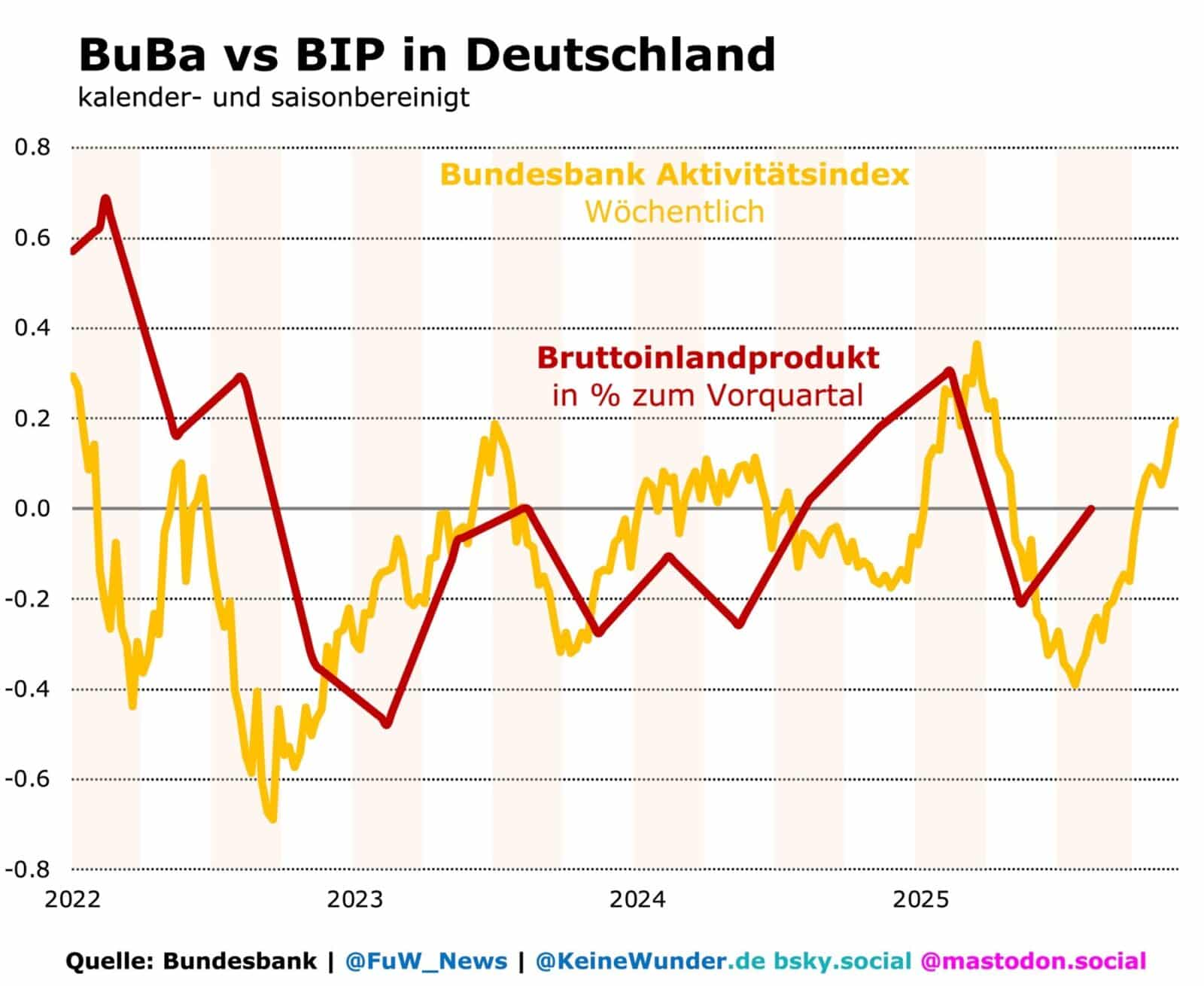 Bei aller Vorsicht, mit der so ein Indikator betrachtet werden sollte, sagt der aktuelle Index klar: Der „dramatische Tiefpunkt“, den der BDI gerade ausmacht, dürfte vorbei sein. Der Bundesbank-Index wird zwar häufig nachträglich revidiert – seit 2022 zeigt er jedoch einen guten Gleichlauf mit dem deutschen Bruttoinlandprodukt. Ein BIP-Einbruch im 4. Quartal kann wohl ausgeschlossen werden: