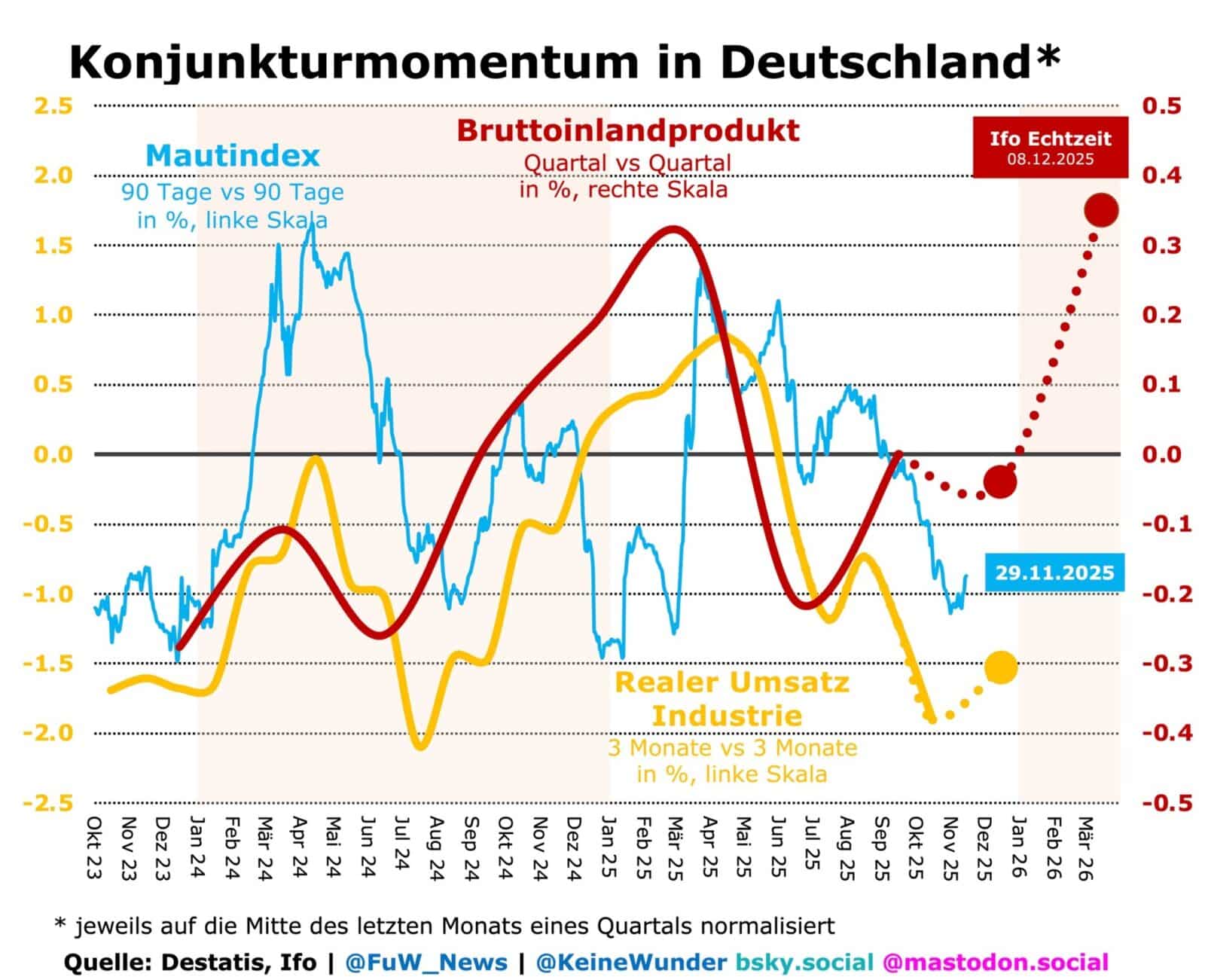 Anhand der aktuellen Datenlage, die größtenteils auf den monatlichen Konjunkturstatistiken und eigenen Umfragen beruht, berechnet das Münchner Ifo-Institut Echtzeitschätzungen zum Bruttoinlandprodukt. Auch wenn die Industrie noch unter dem Rückschlag vom Sommer leidet, liegt die Ifo-Schätzung (keine offizielle Prognose) derzeit bei rund 0% für das BIP im 4. Quartal, für das 1. Quartal des nächsten Jahres sind es bereits ordentliche 0,35%.