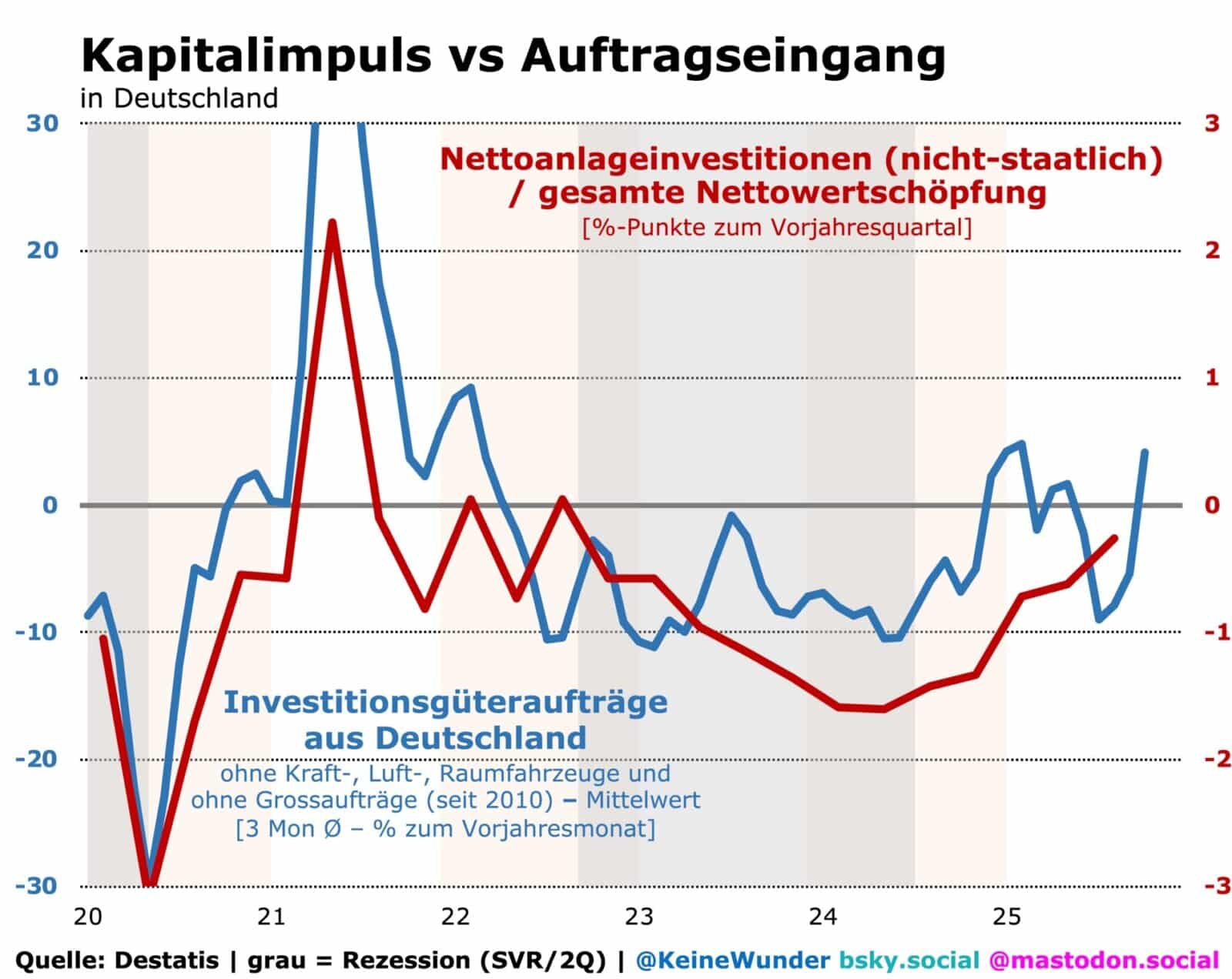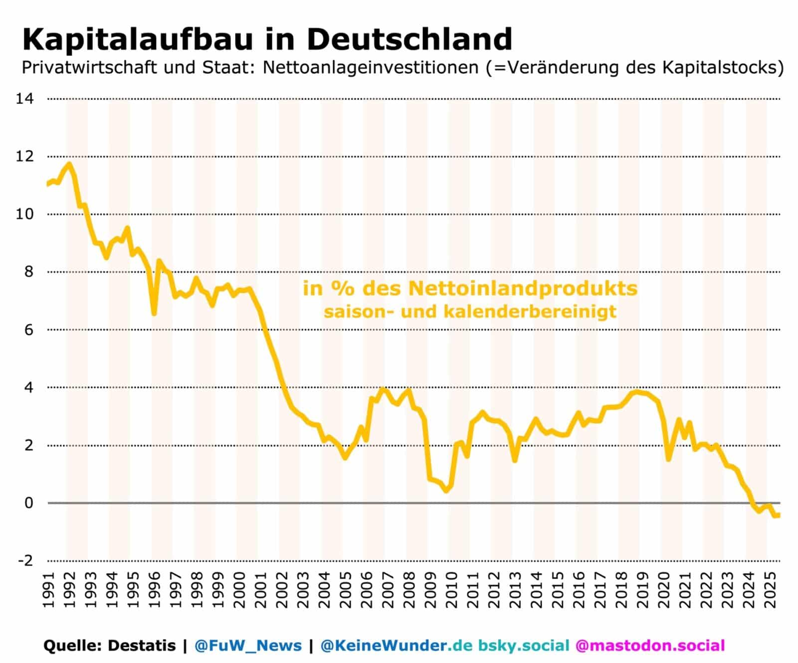 Ein schrumpfender Kapitalstock bedeutet zudem, dass der übliche Konjunktur-Rhythmus aus zyklischem Auf- und Abschwung durcheinandergerät: Der Zyklus besteht gewöhnlich darin, dass der Kapitalstock im Aufschwung schneller ausgeweitet wird als im Abschwung. Dies geht mit einer steigenden Nettoinvestitionsquote einher. Im Abschwung wird der Kapitalstock immer noch ausgeweitet, aber eben langsamer als im Aufschwung. Das wiederum führt zu einer sinkenden Nettoinvestitionsquote.