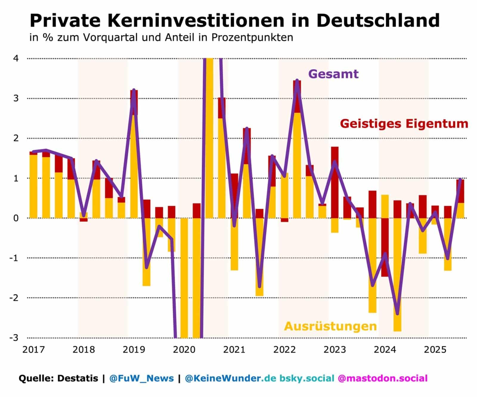 Historisch war ein schrumpfender Kapitalstock immer Ausdruck einer so heftig ausfallenden Wirtschaftskrise, dass sie zum Aufstieg von Populisten und Faschisten führte: Deutschland ab 1931, Italien ab 2010 und zuletzt wieder Deutschland. Glücklicherweise ist die derzeitige Mini-Depression nicht so schwer, dass kein Ausweg erkennbar wäre. Die Privatinvestitionen in Ausrüstungen und geistiges Eigentum (Patente, Forschung usw.) stiegen zuletzt bereits wieder so stark wie seit Anfang 2023 nicht mehr:
