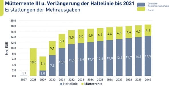 Die Deutsche Rentenversicherung Bund hat erst vergangene Woche die Projektionen vorgelegt, wonach die Mütterrente III und die bisherige Haltelinie von 48% bis 2031 zu Mehrkosten von 18,6 Milliarden im Jahr 2040 führen werden (vgl. Grafik unten). Das gilt dann, wenn Deutschland nicht zum Rentenniveau zurückkehrt, das es ohne die Haltelinie gegeben hätte – was die populistische Forderung der Jungen Union ausmacht.