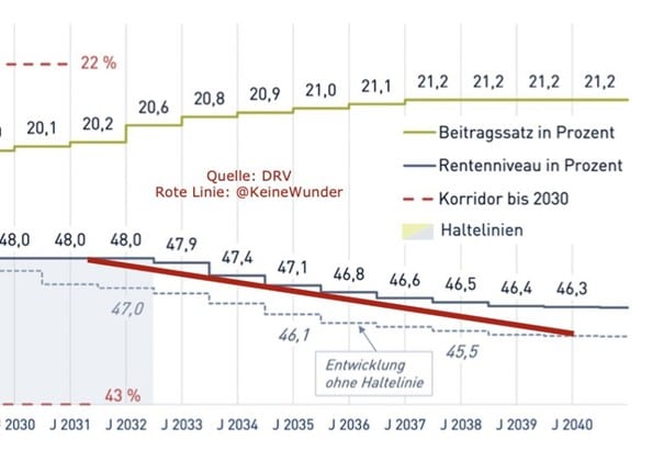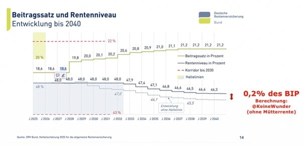 Die aktuelle politische (Phantom-)Debatte in Deutschland dreht sich um folgendes: Die Junge Union möchte wegen 0,2% des BIP notfalls die Koalition platzen lassen. Noch absurder: Die kolportierten rund 120 Milliarden an Mehrkosten zwischen den zwei Projektionen des Rentenniveaus ab 2032 bis 2040 haben gar keine Relevanz.