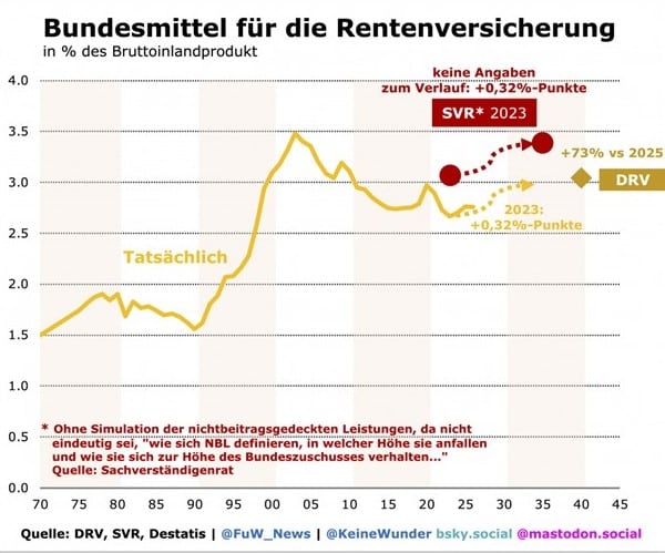 Um wie viel werden nun die Bundesmittel bis 2040 steigen? Die Mittel setzen sich in diesem Jahr aus 93 Milliarden an Zuschüssen und 30 Milliarden an weiteren Mitteln zusammen. Allein für die Zuschüsse erwartet die Rentenversicherung einen Zuwachs um 73% auf 161 Milliarden bis 2040. Aber keine Panik: Auch diese Zahlen müssen im Verhältnis zum BIP betrachtet werden. Würden die weiteren Mittel ebenfalls um 73% wachsen, stiegen die Bundesmittel also von 123 Milliarden im Jahr 2025 auf 213 Milliarden im Jahr 2040. Im Verhältnis zum BIP würde dies bedeuten:  Von 2,76% im Jahr 2025 (eine der niedrigsten BIP-Quoten seit Ende der 90er Jahre – dank der jüngsten Inflation, die auch 2026 konstant bleibt) – auf 3,04% im Jahr 2040. Sollten die sonstigen Mittel bei 30 Milliarden verbleiben, würde die Quote bei 2,73% stagnieren.