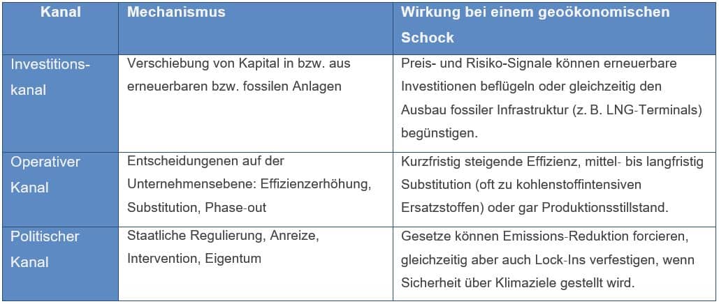 Geoökonomische Schocks wirken sich grundsätzlich durch verschiedene Kanäle auf Dekarbonisierungsprozesse aus (Tabelle 1): vor allem durch Investitionen (fließt mehr Geld in erneuerbare oder fossile Energien?), operative Entscheidungen auf Firmenebene (wirken Effizienz- oder Substitutionsmaßnahmen?), oder politische Reaktionen (bemühen sich Entscheidungsträger:innen um zügigere oder umfassendere Maßnahmen oder treten sie auf die Bremse?).