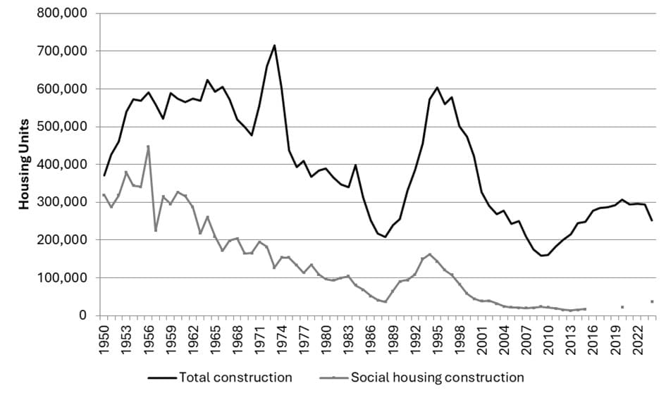 Wie Abbildung 1 zeigt, unterstützte der Staat in den 1950er Jahren den Bau von durchschnittlich etwa 320.000 Sozialwohnungen pro Jahr, in den 1960er Jahren waren es 240.000 und in den 1970er Jahren noch 150.000. Als sich die Wohnungsnot der Nachkriegszeit entspannte, ging der Bau von Sozialwohnungen zurück, von einer kurzen Ausnahme in den Jahren nach der Wiedervereinigung abgesehen. Bis 2020 war die Zahl trotz erneut auftretender Engpässe auf knapp 23.000 neue Wohnungen gesunken und stieg bis 2024 nur leicht auf 37.000 – ein Schatten dessen, was in den Nachkriegsjahrzehnten möglich war.
