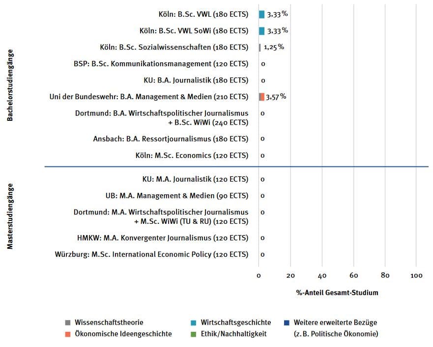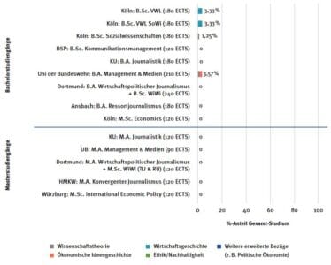Lesehilfe: Die Farben der Balken zeigen an, ob Module mit bestimmten reflexiven Inhalten in einem jeweiligen Studiengang als Pflichtveranstaltung vorkommen. Die horizontale Länge des Balkens zeigt, in welchem Umfang das entsprechende Modul im Hinblick auf das Gesamtstudium belegt werden muss. Berechnungsgrundlage sind die nach Relevanz gewichteten ECTS-Punkte.