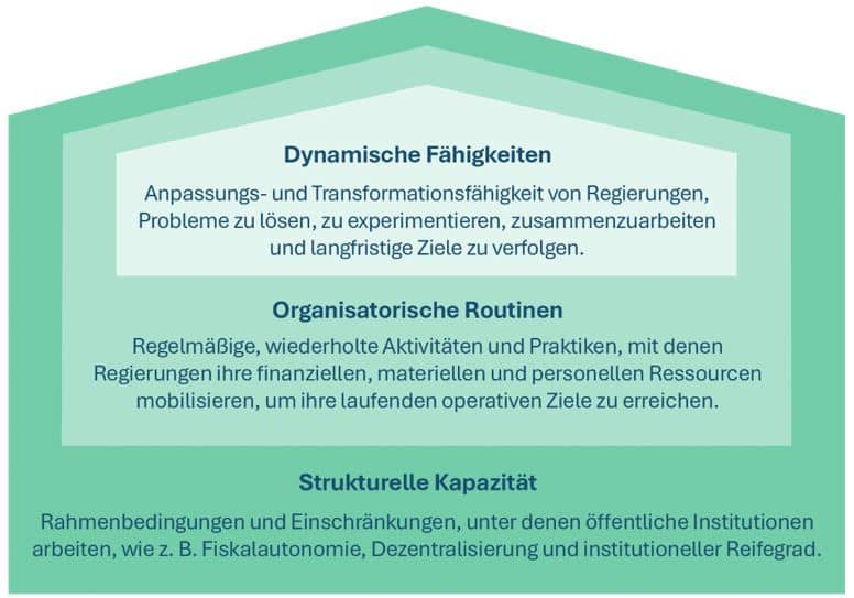 Der Index fokussiert sich bewusst auf Fähigkeiten, da diese die Voraussetzung dafür sind, staatliche Kapazitäten in Wirkung zu überführen. Auch wenn beide Begriffe häufig synonym verwendet werden, besteht ein wesentlicher Unterschied zwischen Kapazität und Fähigkeit. Kapazität bezeichnet die Ressourcen, Strukturen und Rahmenbedingungen, die staatliches Handeln ermöglichen – etwa Personal, finanzielle Mittel, Instrumente und Zeit. Fähigkeit hingegen beschreibt die Routinen, Prozesse und Koordinationsformen, die bestimmen, wie diese Ressourcen eingesetzt werden: also die Fähigkeit, zu innovieren, sich anzupassen und Ergebnisse zu erzielen.